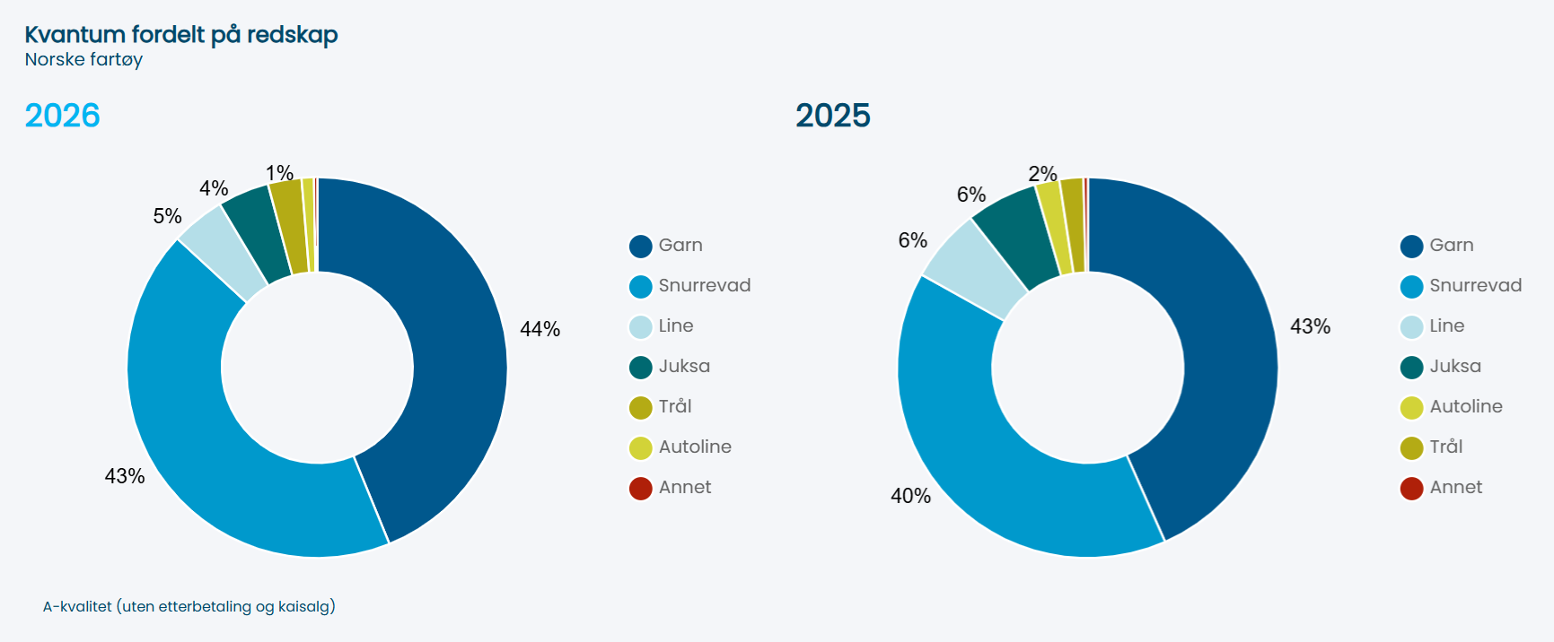 Fordelt på redskap er det hittil i år tatt mest på garn med 15.601 tonn mot 17.708 tonn samme periode i fjor, deretter snurrevad med 15.290 tonn i år mot 18.594 tonn i fjor. På line er det hittil i år fanget 2.009 tonn, mot 1.741 tonn i fjor, for trål er kvantum fersk torsk 1.014 tonn i år mot 1.126 tonn i fjor, og for juksa er det tatt 1.555 tonn i år mot 2.313 tonn i fjor.