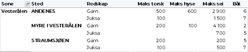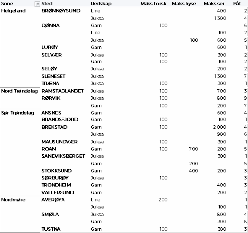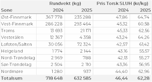 Tabell 2 og 3 viser fordelingen av landingene av fersk torsk per leveringssone og redskap (unntatt trål), med tilhørende snittpriser. De to tabellene er basert på omsetning av kvalitet A og ekstra, der alle leveringstilstander inngår, men der snittprisene er omregnet til sløyd uten hode-priser, eksklusivt restråstoff.