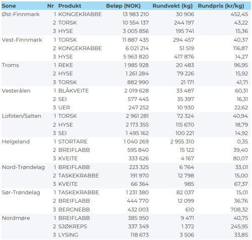 I uke 31 ble det totalt levert og omsatt 96 tonn kongekrabbe til 21 millioner kroner. En liten nedgang fra forrige ukes 114 tonn/25 millioner kroner. Av totalen i uke 31 var 45 tonn tatt i det regulerte området til en verdi på 17.8 millioner kroner, levert av 157 båter. I frifisket ble det tatt 51 tonn til en verdi på 3.6 millioner kroner, der 22 båter deltok med leveranser. Totalt for alle fangstfelt samlet er det fanget mest i området rundt Magerøya med 37 tonn, deretter 10 tonn i området mellom Berlevåg og Båtsfjord, 9.6 tonn i området Hjelmsøya, 9 tonn i Tanafjorden, 7.8 tonn i Porsangerfjorden, 7.5 tonn i Varangerfjorden, 5 tonn i Laksefjorden og 4.3 tonn mellom Ingøy og Måsøy. Kvanta under 0,5 tonn i resterende fangstfelt.