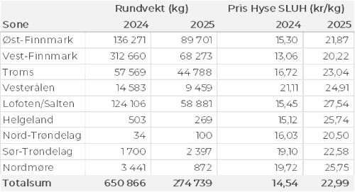 I uke 32 kom kvantum omsatt fersklevert hyse på 275 tonn til en verdi av 4.5 millioner kroner. Dette er en nedgang fra forrige ukes 814 tonn / 12.5 millioner kroner. Tabell 5 viser sonevis fordeling av kvanta. Mest er omsatt i Øst-Finnmark med nesten 90 tonn, dernest Vest-Finnmark med 68 tonn, og Lofoten/Salten med 59 tonn. 221 tonn var tatt med snurrevad, 39 tonn på line/autoline og 13 tonn på settegarn.