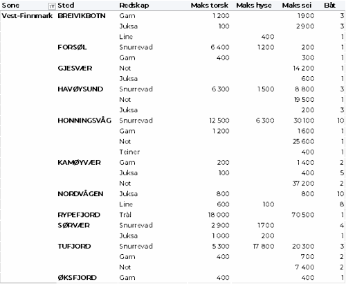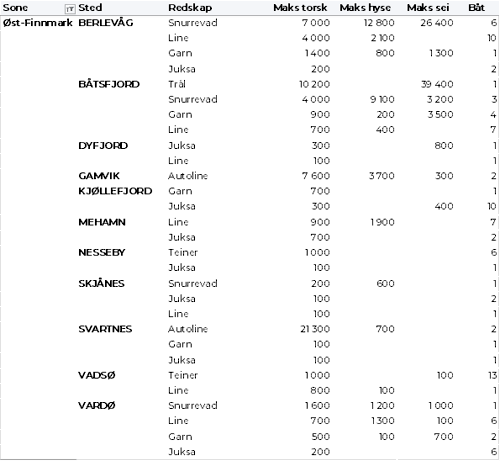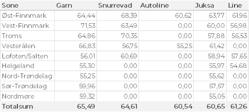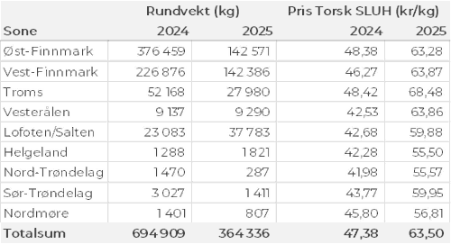 Omsetningen av fersk torsk i uke 32 utgjorde 404 tonn til verdi 17 millioner kroner. En nedgang fra 642 tonn/ 27 millioner kroner uken før. Av totalkvantumet stod snurrevad for 209 tonn etterfulgt av line/autoline med 95 tonn, garn med 41 tonn og juksa med 19 tonn. Av snurrevadkvantumet var 121 tonn levert til kjøpere i Vest-Finnmark, 37 tonn i Øst-Finnmark og 29 tonn i Lofoten. 94 % av linekvantumet var levert i Øst-Finnmark, mens det var større spredning på garnkvantumet. Kvanta fordelt per leveringssone fremgår av tabell 2. 80 % av kvantumet var levert i Finnmark.