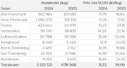 Omsetningen av fersk sei kom på 790 tonn til en verdi av 11.1 millioner kroner i uke 32 , en liten nedgang fra 878 tonn / 12 millioner kroner forrige uke. Kvanta fersk sei fordelt per leveringssone fremgår av tabell 4. Mest aktivitet var det i Vest-Finnmark med 351 tonn, etterfulgt av Øst-Finnmark med 123.7 tonn og Lofoten/Salten med 90.5 tonn. På redskap var 307 tonn tatt med snurrevad, 156 tonn med not, 131 tonn med settegarn, 110 tonn på trål og 74 tonn med juksa. Det var 6 ulike fartøy som leverte notsei til 4 ulike kjøpere i Vest-Finnmark. Av 307 tonn snurrevadsei var 162 tonn levert i Vest-Finnmark, 102 tonn i Øst-Finnmark og 41 tonn i Lofoten/Salten.