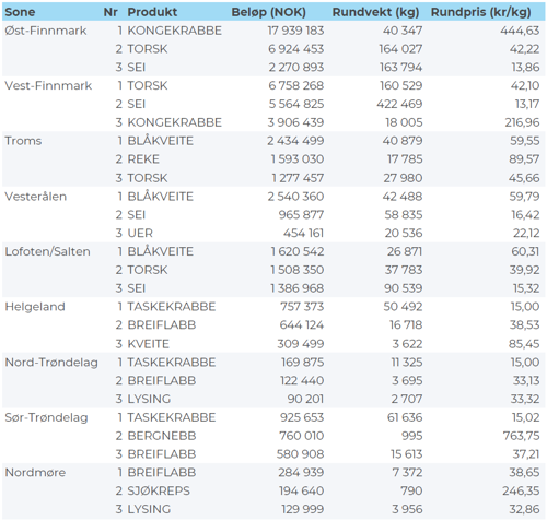 Det meste av dette var det kongekrabbe, torsk, krill, sei og blåkveite som stod for med henholdsvis 22, 17, 13, 11 og 7,5 millioner kroner, omsetning for resterende arter fremkommer av tabell 1.