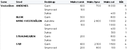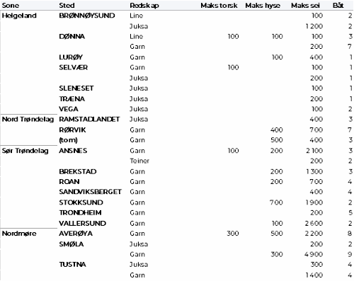 Tabell 2 og 3 viser fordelingen av landingene av fersk torsk per leveringssone og redskap (unntatt trål), med tilhørende snittpriser. De to tabellene er basert på omsetning av kvalitet A og ekstra, der alle leveringstilstander inngår, men der snittprisene er omregnet til sløyd uten hode-priser, eksklusivt restråstoff.