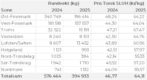 Omsetningen av fersk torsk i uke 34 utgjorde 425 tonn til verdi 18,5 millioner kroner. En nedgang fra 535 tonn/ 22,8 millioner kroner uken før. Av totalkvantumet stod snurrevad for 266 tonn, etterfulgt av line/autoline på 91 tonn og garn med 34 tonn. Kvanta under 16 tonn per redskap for resterende. Det meste er levert i Finnmark der Øst-Finnmark står for 210 tonn og Vest-Finnmark 174 tonn. Kvanta under 16 tonn per sone for resterende.