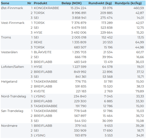 Omsetningen av ferskt råstoff i uke 34 utgjorde 78 millioner kroner, en nedgang fra 103 millioner kroner uken før. Det meste av dette var det kongekrabbe, torsk, sei, hyse og breiflabb som stod for med henholdsvis 19, 19, 15, 7,5 og 3,5 millioner kroner. Omsetning for resterende arter fremkommer av tabell 1.