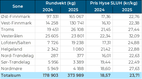 Hittil i år er det omsatt om lag 1.003 tonn til en verdi av 70,2 millioner kroner, mot 1.634 tonn og 98,8 millioner kroner i samme periode i fjor. Gjennomsnittsprisen for rund ligger dermed 9,4 kroner høyere enn på samme tid i fjor.