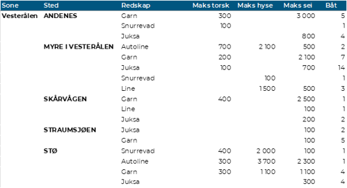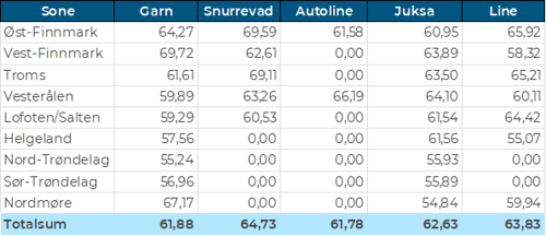 Tabell 2 og 3 viser fordelingen av landingene av fersk torsk per leveringssone og redskap (unntatt trål), med tilhørende snittpriser. De to tabellene er basert på omsetning av kvalitet A og ekstra, der alle leveringstilstander inngår, men der snittprisene er omregnet til sløyd uten hode-priser, eksklusivt restråstoff.