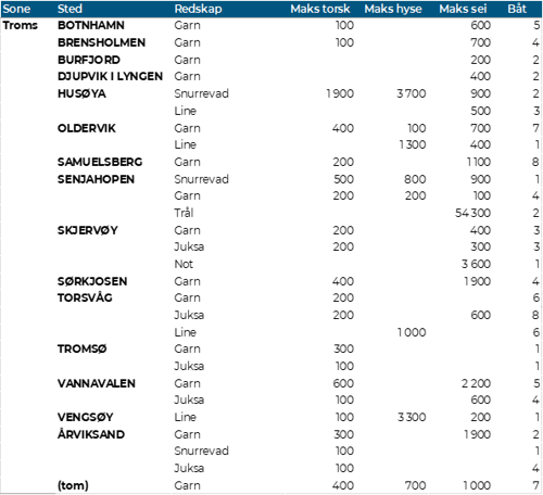 Omsetningen av fersk torsk i uke 38 kom på 333 tonn til en verdi på 14 millioner kroner, ned fra forrige ukes 366 tonn / 15 millioner kroner. Størst kvantum var tatt på snurrevad som leverte 137 tonn, fordelt på 37 fartøy, etterfulgt av line/autoline med 115 tonn og garn med 52 tonn. 270 tonn er levert i Finnmark jevnt fordelt på øst- og vestfylket. Kvanta under 30 tonn per sone for resterende.