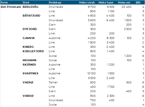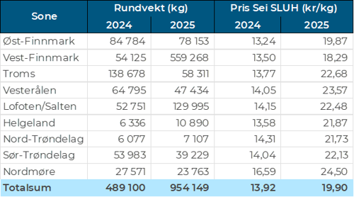 Omsetningen av fersk sei i uke 38 utgjorde nær 1.300 tonn til verdi 19 millioner kroner, som er opp fra 1.200 tonn og 18 millioner kroner uka før. Kvanta fersk sei fordelt per leveringssone fremgår av tabell 4. Mesteparten ble levert i Vest-Finnmark med 800 tonn, etterfulgt av Troms med 150 tonn, Lofoten/Salten med 130 tonn og Øst-Finnmark med 80 tonn. Av totalen ble 490 tonn tatt med not av 4 fartøy, det meste levert til 2 kjøpere i Vest-Finnmark. Videre var 330 tonn levert av 4 trålere, 210 tonn var tatt på garn, 110 tonn på snurrevad, 87 tonn på juksa og 57 tonn på line/autoline.