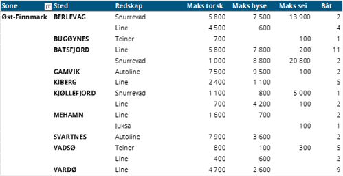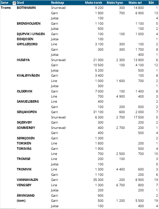 Hittil i år står garnfisket for 3.800 tonn av all fersk torsk, sammenliknet med samme periode i fjor som var på 2.171 tonn, hvor uke 4 i 2025 utgjorde 1.266 tonn av denne totalen. Mengden fra trål er redusert fra 114 tonn i uke 4 i 2025 til 76 tonn samme uke i 2026, samlet er det en reduksjon fra 645 tonn hittil i år i 2025 til 379 tonn hittil i år i 2026. Så langt i år er det landet 2.451 tonn fersk torsk i Vest-Finnmark, sammenlignet med samme periode i fjor som lå på 1.369 tonn, hvor garn står for nesten alt av fangsten. Troms ser en økning i samme periode fra 1.053 tonn til 1.547 tonn med en lik redskapsfordeling som Vest-Finnmark. Øst-Finnmark ser en nedgang fra 730 tonn til 632 tonn, mens Vesterålen ser en oppgang fra 576 tonn til 618 tonn, hvor garnfangsten har stått for mye av oppgangen sammenliknet med samme periode i fjor.