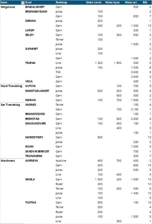 Tabell 2 og 3 viser fordelingen av landingene av fersk torsk per leveringssone og redskap (unntatt trål), med tilhørende snittpriser. De to tabellene er basert på omsetning av kvalitet A og ekstra, der alle leveringstilstander inngår, men der snittprisene er omregnet til sløyd uten hode-priser, eksklusivt restråstoff.