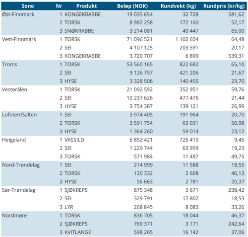 Fordelt på fangstområde ble det i uke 4 fanget mest i Varangerfjorden med 12 tonn, deretter i havområdet mellom Båtsfjord og Berlevåg med 10 tonn, 7 tonn hver i Porsangerfjorden og Tanafjorden, 4 tonn i Syltefjorden, 3 tonn i Laksefjorden, og under 3 tonn i resterende fangstområder.