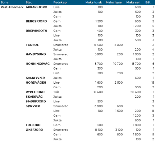 Det ble omsatt 42 tonn ferske reker i uke 40, til en verdi på 3,0 millioner kroner, en økning fra 28 tonn / 2,1 millioner kroner uka før. Fordelt på fangstfelt ble det fisket mest i Altafjorden med 17 tonn levert av 5 båter, Varangerfjorden med 9 tonn levert av 7 båter, 7 tonn i Kvænangen der det var leveranser fra 4 båter, 3 tonn i Lyngenfjorden, 2 tonn i Ullsfjorden og 1,4 tonn på Andfjorden. Kvanta under 1 tonn i resterende fangstfelt.