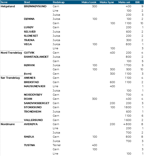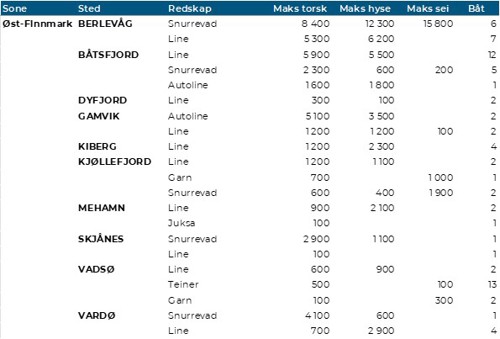Tabell 2 og 3 viser fordelingen av landingene av fersk torsk per leveringssone og redskap (unntatt trål), med tilhørende snittpriser. De to tabellene er basert på omsetning av kvalitet A og ekstra, der alle leveringstilstander inngår, men der snittprisene er omregnet til sløyd uten hode-priser, eksklusivt restråstoff.