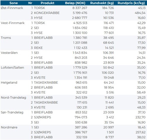 Omsetningen av ferskt råstoff i uke 40 utgjorde 59 millioner kroner, som var opp fra 43 millioner kroner uken før. Det meste av dette var torsk, sei, hyse, breiflabb, kongekrabbe, kveite og reke, som sto for henholdsvis 15, 9, 6, 6, 6, 4 og 3 millioner kroner. Omsetning for disse og resterende arter fremkommer av tabell 1.