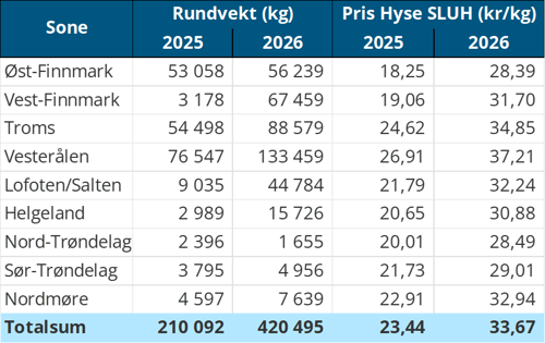 Kvantumet fersklevert hyse i uke 6 er 420 tonn til verdi 10,1 millioner kroner, litt opp fra 400 tonn/9,1 millioner kroner uken før. Hittil i 2026 er det omsatt 2.250 tonn fersk hyse til 51,7 millioner kroner. Kvantumet er ned fra 2.350 tonn samme periode i 2025, men verdien er økt fra 40,8 millioner kroner. For uke 6 er det god spredning i fisket, jf. tabell 5, med en topp i Vesterålen. Det meste av kvantumet er tatt med line, som står for 270 av de 420 tonnene omsatt i uke 6.