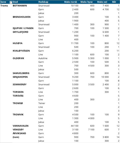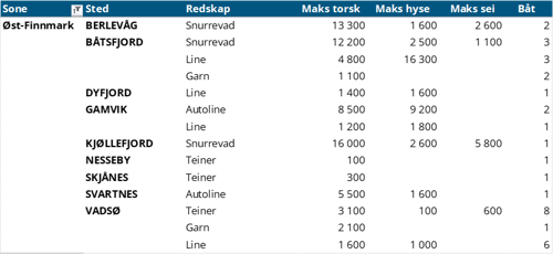 Fordelt på fangstområde ble det i uke 6 fanget mest i Varangerfjorden med 13 tonn, deretter 10 tonn i havområdet mellom Båtsfjord og Berlevåg, 7 tonn i Porsangerfjorden, 4 tonn i Tanafjorden, 3 tonn i Laksefjorden og 2,2 tonn utenfor Gamvik. Kvanta under 1 tonn i resterende fangstområder.