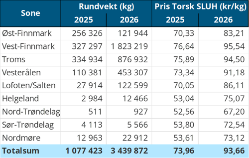 Omsetningen av fersk torsk i uke 6 havnet på 3.690 tonn til en verdi av 232 millioner kroner, sammenliknet med 2.860 tonn og 178 millioner kroner uka før. Samme uka i fjor var omsatt kvantum 1.320 tonn, til verdi 66 millioner kroner. Hittil i 2026 er det omsatt 12.000 tonn fersk torsk til verdi 753 millioner kroner, mot 7.650 tonn og 377 millioner kroner til samme tid i fjor. Kvantumsøkingen er kommet i Vest-Finnmark (opp fra 2.870 til 6.080 tonn) og Troms (fra 1.840 til 3.020 tonn). Det er økte kvanta tatt på garn, opp fra 4.360 til 7.390 tonn, snurrevad har økt sitt kvantum fra 1.640 til 2.600 tonn. Line og juksa har også økt sitt kvantum, til henholdsvis 880 og 270 tonn. Leveransene av fersk tråltorsk er ned fra 930 til 790 tonn. Prisutviklingen uttrykt i snittpriser framgår av tabell 2.