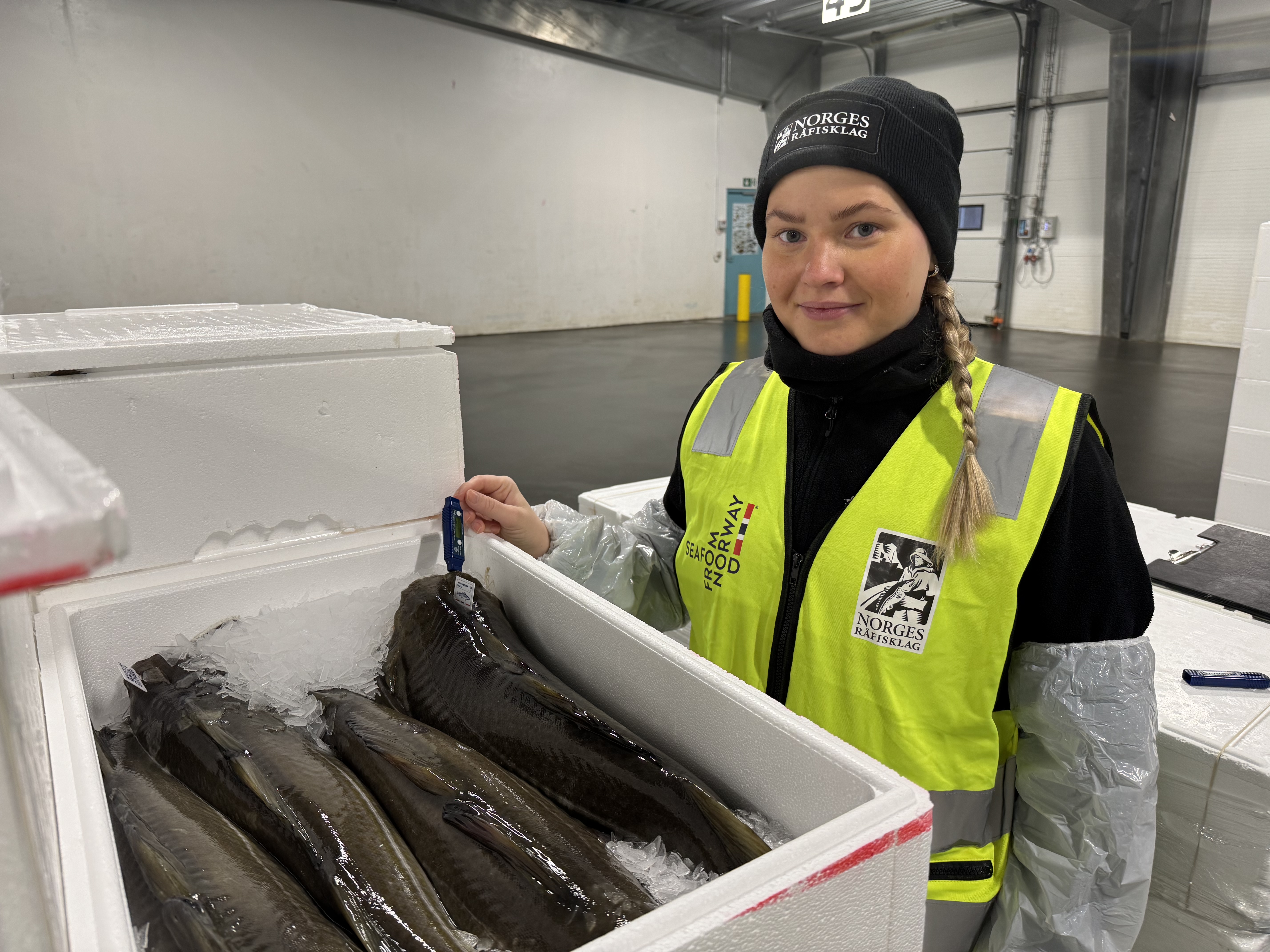 Skreipatruljens Ronje Berg sjekker kvaliteten på en tilfeldig utvalgt eske med kvalitetsmerket Skrei på en omlastingsterminal i Europa. Temperaturkontroll er en av de viktige sjekkpunktene som utføres. For at skreien skal ha lang holdbarhet, er det viktig at den er kjølt ned mot null grader før den pakkes i esker, slik at isen smelter sakte under transport og holder fisken kjølig hele veien frem til sluttkunde. Denne skreien var perfekt.